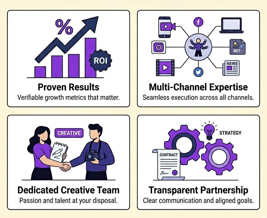We partner with startups, local businesses, and growing brands to deliver creative content, performance marketing, and social media growth that drives real results.